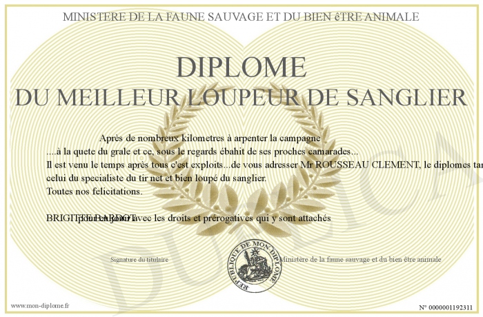 Envoyez par email votre Diplôme du meilleur loupeur de sanglier personalisé