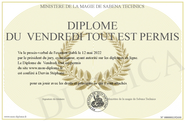 Envoyez par email votre Diplôme du Vendredi tout est permis personalisé