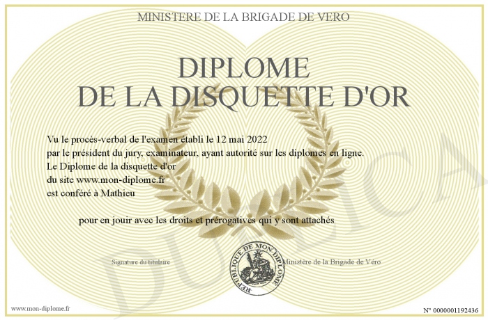 Envoyez par email votre Diplôme de la disquette d'or personalisé