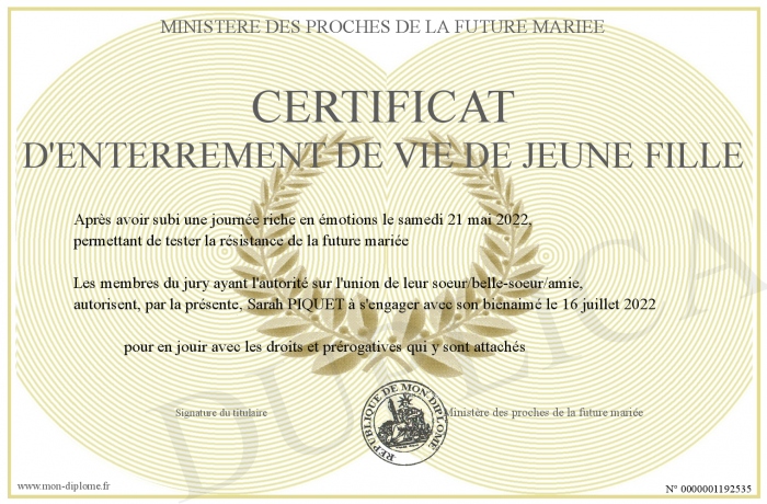 Envoyez par email votre Certificat d'enterrement de vie de jeune fille personalisé