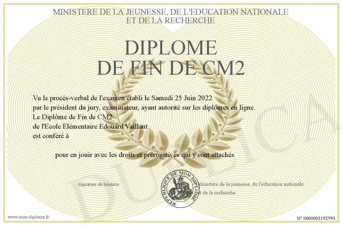 Envoyez par email votre Diplôme de Fin de CM2 personalisé