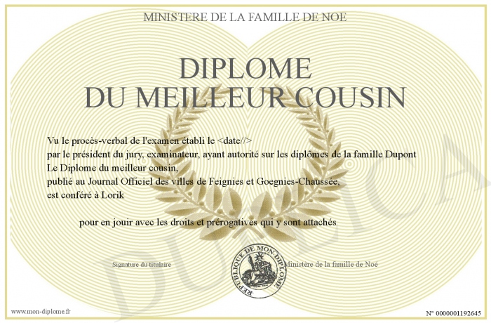 Envoyez par email votre Diplôme du meilleur cousin personalisé