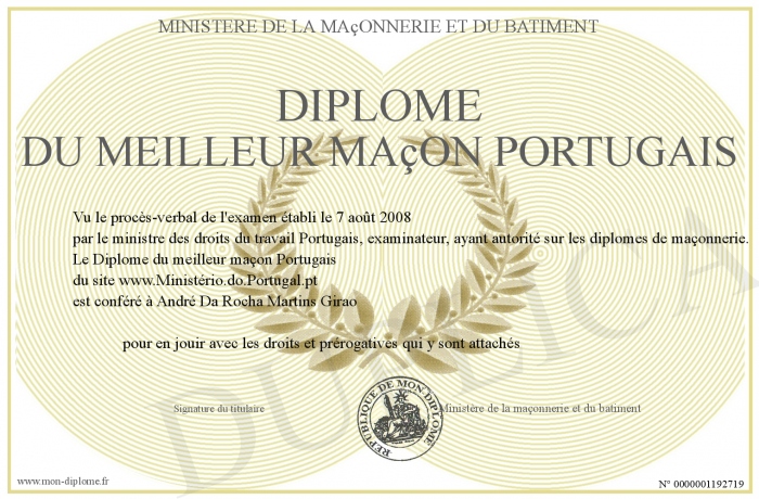 Envoyez par email votre Diplôme du meilleur maçon Portugais personalisé