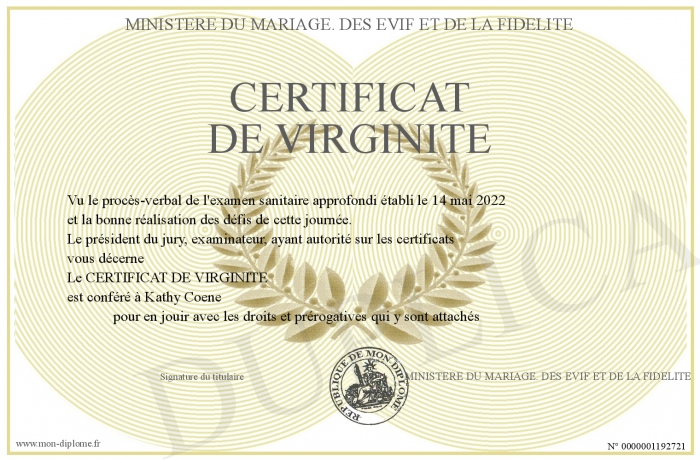 Envoyez par email votre CERTIFICAT DE VIRGINITE personalisé