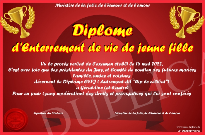Envoyez par email votre Diplome d'Enterrement de vie de jeune fille personalisé