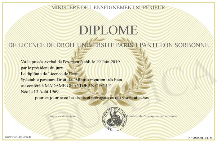 Envoyez par email votre Diplôme de Licence de Droit Université Paris 1 Panthéon Sorbonne personalisé
