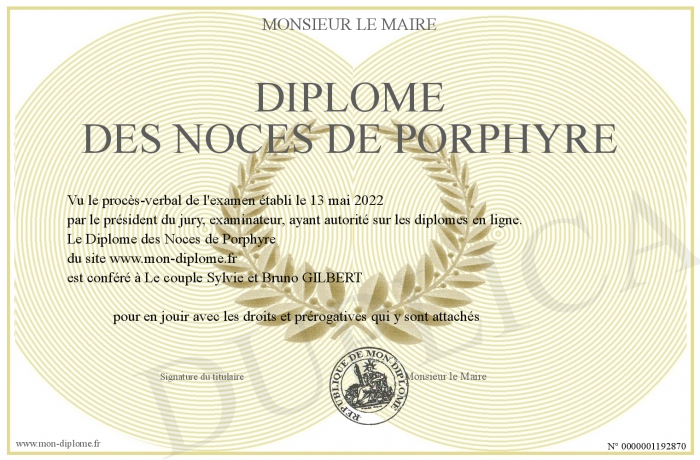 Envoyez par email votre Diplôme des Noces de Porphyre personalisé