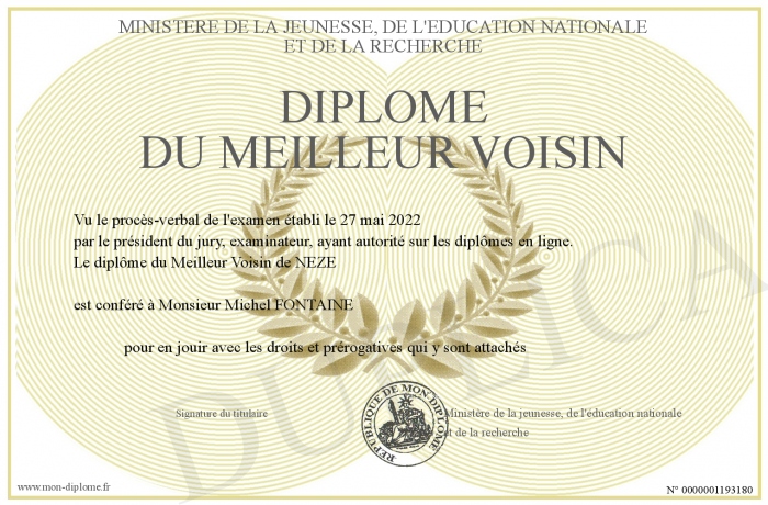 Envoyez par email votre diplôme du Meilleur Voisin personalisé