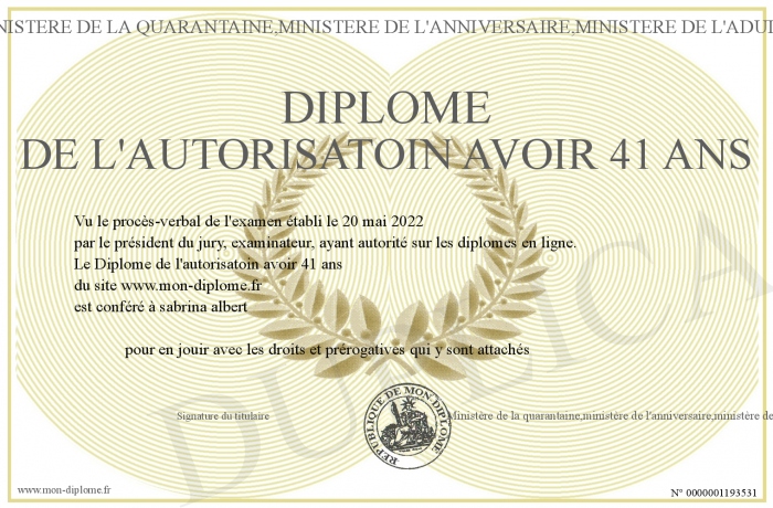 Envoyez par email votre Diplôme de l'autorisatoin avoir 41 ans personalisé