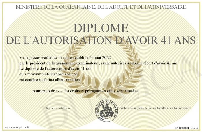 Envoyez par email votre Diplôme de l'autorisation d'avoir 41 ans personalisé