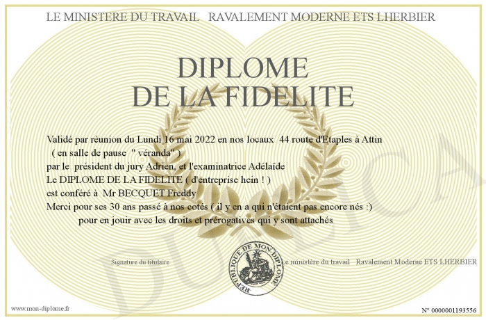 Envoyez par email votre DIPLOME DE LA FIDELITE personalisé