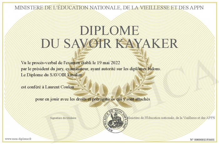 Envoyez par email votre Diplôme du SAVOIR kayaker personalisé