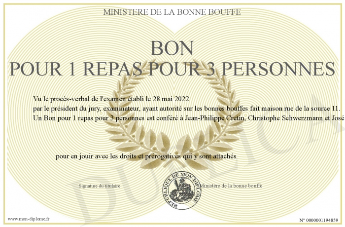 Envoyez par email votre Bon pour 1 repas pour 3 personnes personalisé