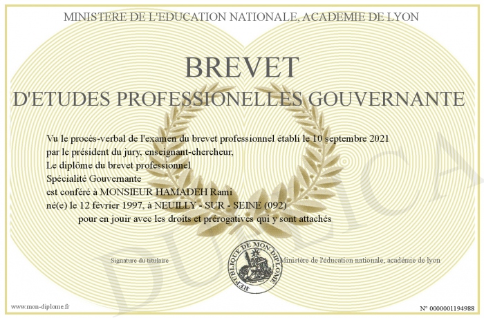 Envoyez par email votre Brevet d'études professionelles gouvernante personalisé