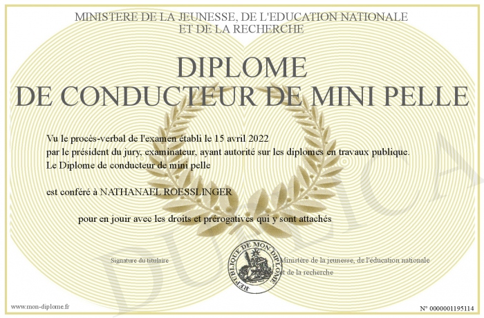 Envoyez par email votre Diplôme de conducteur de mini pelle personalisé
