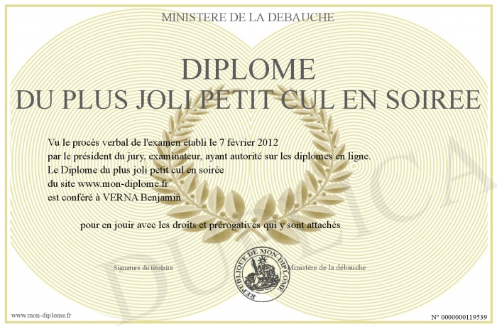 Envoyez par email votre Diplôme du plus joli petit cul en soirée personalisé