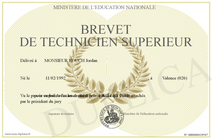 Envoyez par email votre Brevet de Technicien Supérieur personalisé