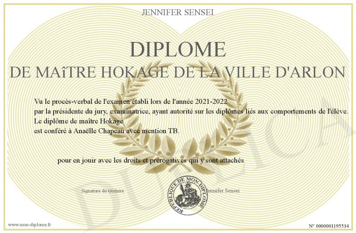 Envoyez par email votre Diplôme de maître Hokage de la ville d'Arlon personalisé