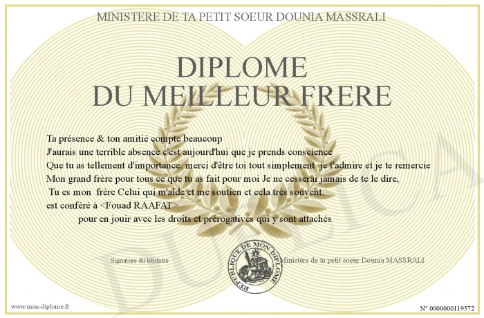 Envoyez par email votre Diplôme du meilleur Frère personalisé