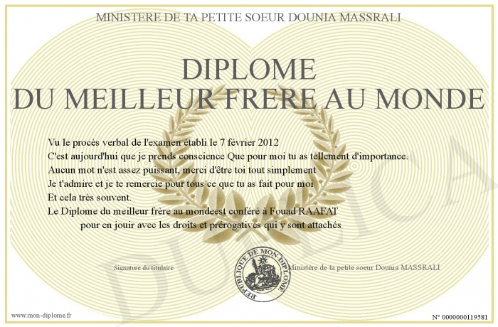 Envoyez par email votre Diplôme du meilleur frère au monde personalisé