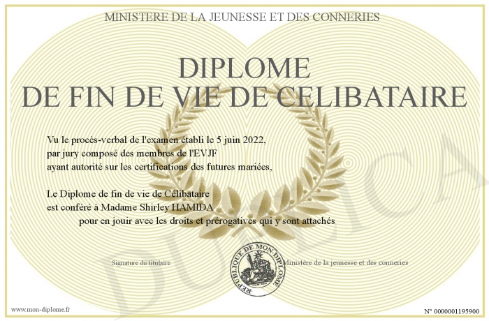 Envoyez par email votre Diplôme de fin de vie de Célibataire personalisé