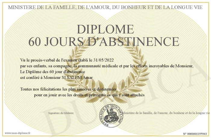Envoyez par email votre Diplôme 60 jours d'abstinence personalisé