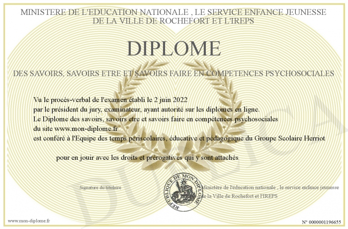 Envoyez par email votre Diplôme des savoirs, savoirs etre et savoirs faire en compétences psychosociales personalisé