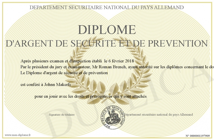 Envoyez par email votre Diplôme d'argent de sécurité et de prévention personalisé