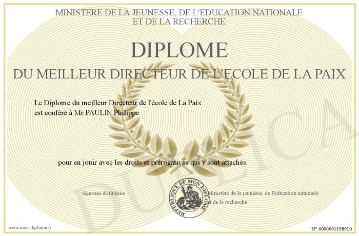 Envoyez par email votre Diplôme du meilleur Directeur de l'école de La Paix personalisé