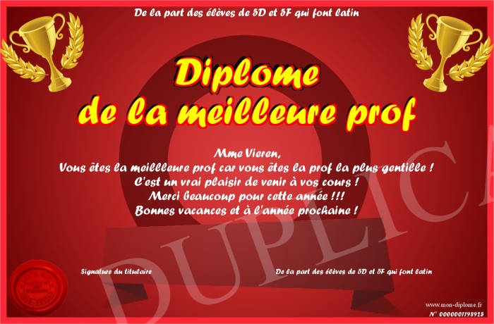Envoyez par email votre Diplôme de la meilleure prof personalisé