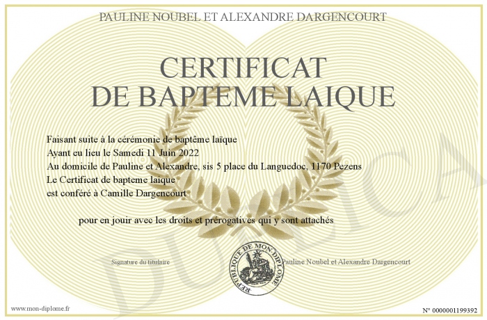 Envoyez par email votre Certificat de bapteme laique personalisé