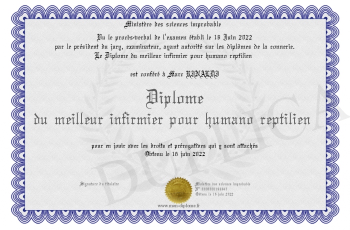 Envoyez par email votre Diplôme du meilleur infirmier pour humano reptilien personalisé