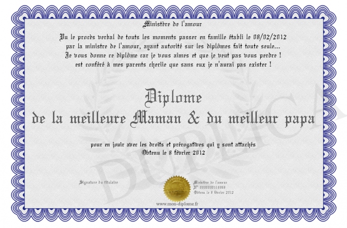 Envoyez par email votre Diplome de la meilleure Maman & du meilleur papa personalisé