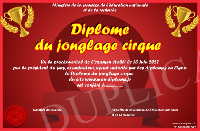 Envoyez par email votre Diplôme du jonglage cirque personalisé