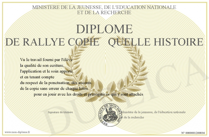 Envoyez par email votre Diplôme de rallye copie Quelle Histoire personalisé