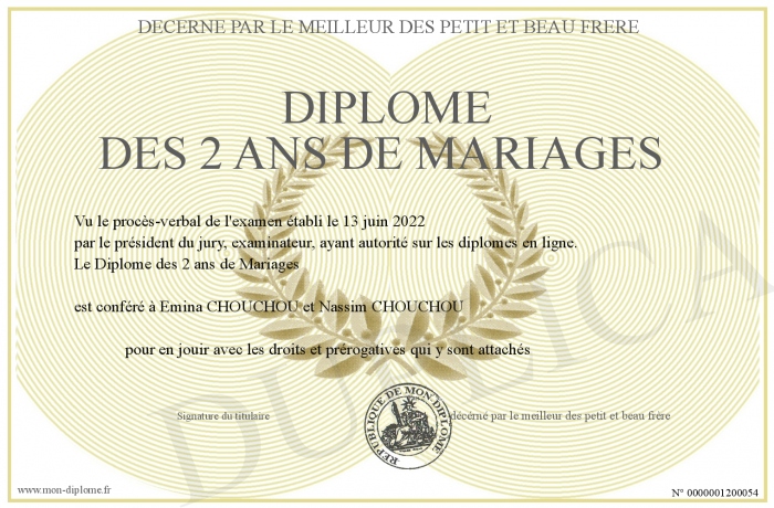 Envoyez par email votre Diplôme des 2 ans de Mariages personalisé