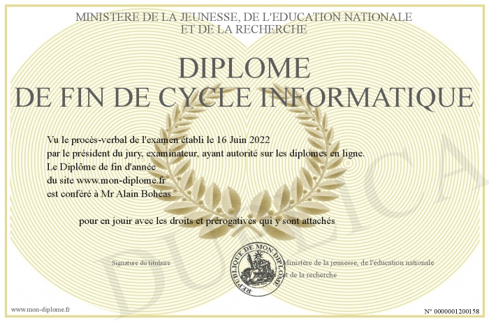 Envoyez par email votre Diplôme de fin de cycle Informatique personalisé