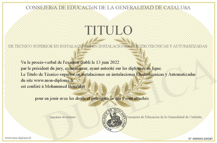 Envoyez par email votre Titulo de Técnico superior en instalaciones en instalaciones Electrotécnicas y Automatizadas personalisé