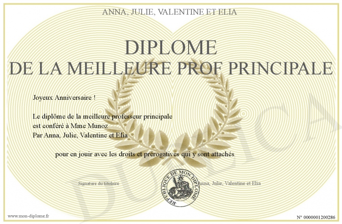 Envoyez par email votre Diplôme de la meilleure prof principale personalisé