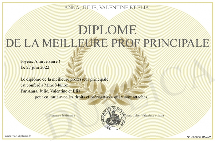 Envoyez par email votre Diplôme de la meilleure prof principale personalisé