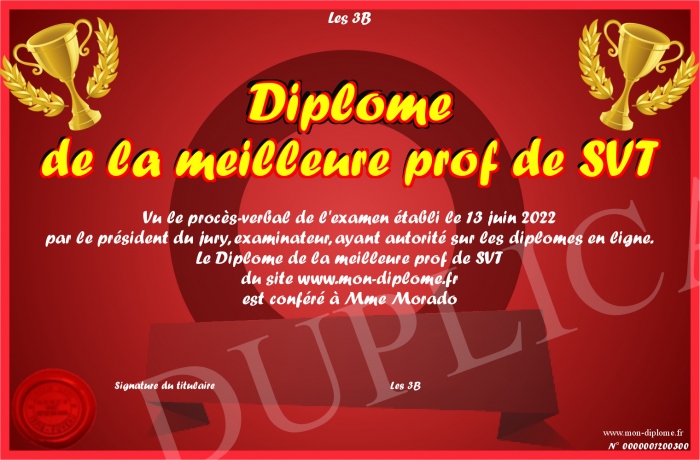 Envoyez par email votre Diplôme de la meilleure prof de SVT personalisé
