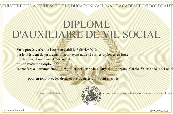Envoyez par email votre Diplôme d'auxiliaire de vie social personalisé