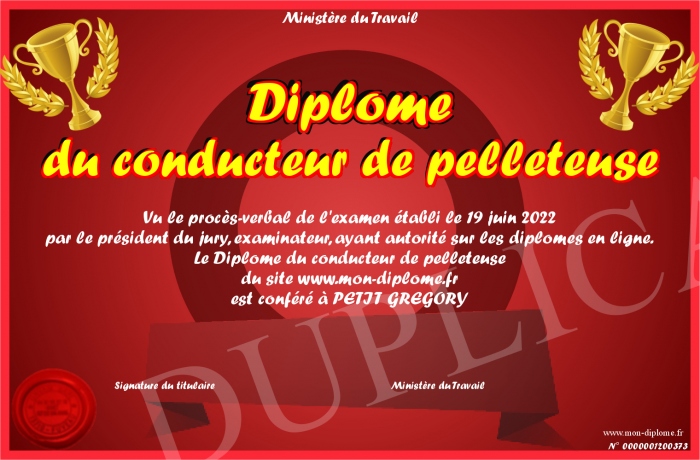 Envoyez par email votre Diplôme du conducteur de pelleteuse personalisé