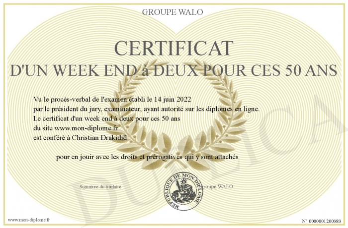 Envoyez par email votre certificat d'un week end à deux pour ces 50 ans personalisé