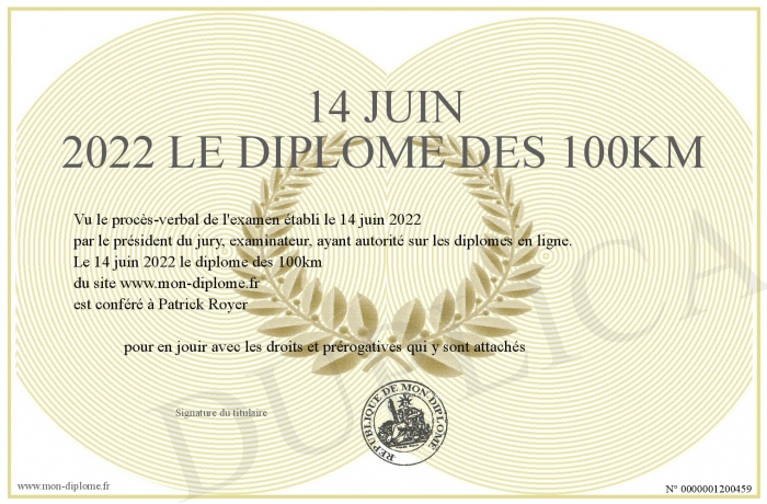Envoyez par email votre 14 juin 2022 le diplôme des 100km personalisé