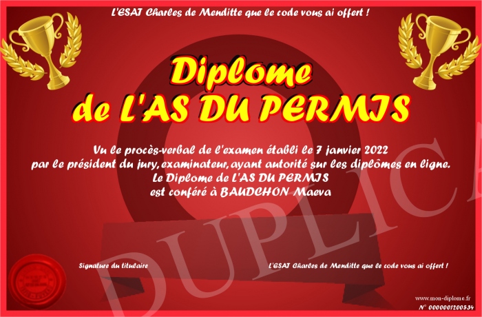 Envoyez par email votre Diplôme de L'AS DU PERMIS personalisé