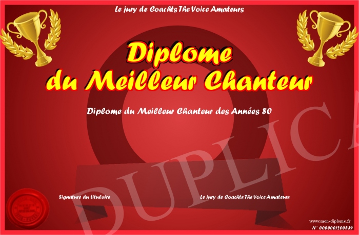Envoyez par email votre Diplôme du Meilleur Chanteur personalisé