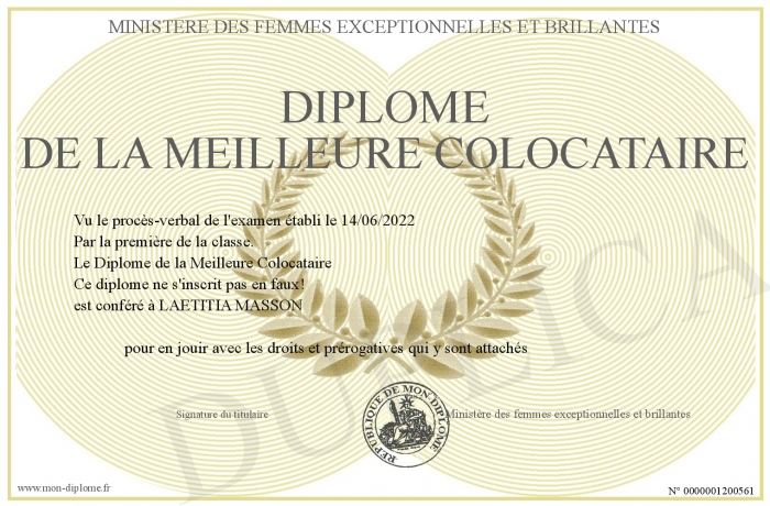 Envoyez par email votre Diplôme de la Meilleure Colocataire personalisé