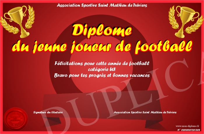 Envoyez par email votre Diplôme du jeune joueur de football personalisé