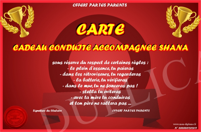 Envoyez par email votre CARTE CADEAU CONDUITE ACCOMPAGNEE SHANA personalisé
